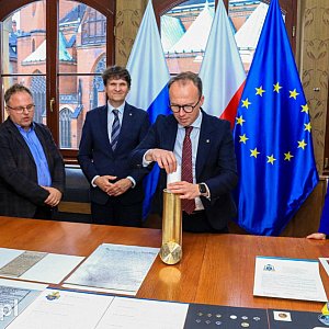 Latem tego roku w tej samej kuli odnaleziono kapsułę z XVII wieku. W środku były monety i dokumenty, z których najstarszy nosił datę 1650. Odkrycie wzbudziło ogromne zainteresowanie, a w sierpniu szeroko o nim pisaliśmy. Niedawno legniczanie mogli obejrzeć zarówno zabytkowe skarby, jak i współczesne przedmioty, które złożono w nowej kapsule, na wystawie przygotowanej w katedrze.