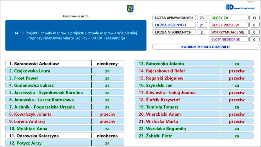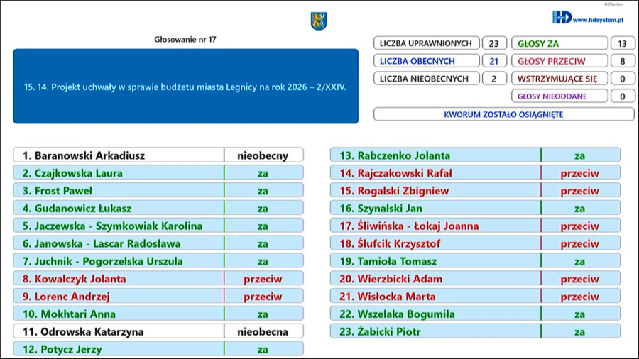 Rada Miejska przyjęła uchwałę w sprawie Wieloletniej Prognozy Finansowej miasta oraz budżetu miasta Legnicy na 2026 rok. Oba projekty uzyskały poparcie 13 radnych, przy 8 głosach przeciw i braku głosów wstrzymujących się. Głosowania poprzedziła prezentacja skarbnika miasta Kacpra Siwka. Debata sprowadziła się do tego, że swoje stanowiska przedstawili przedstawiciele klubów radnych.