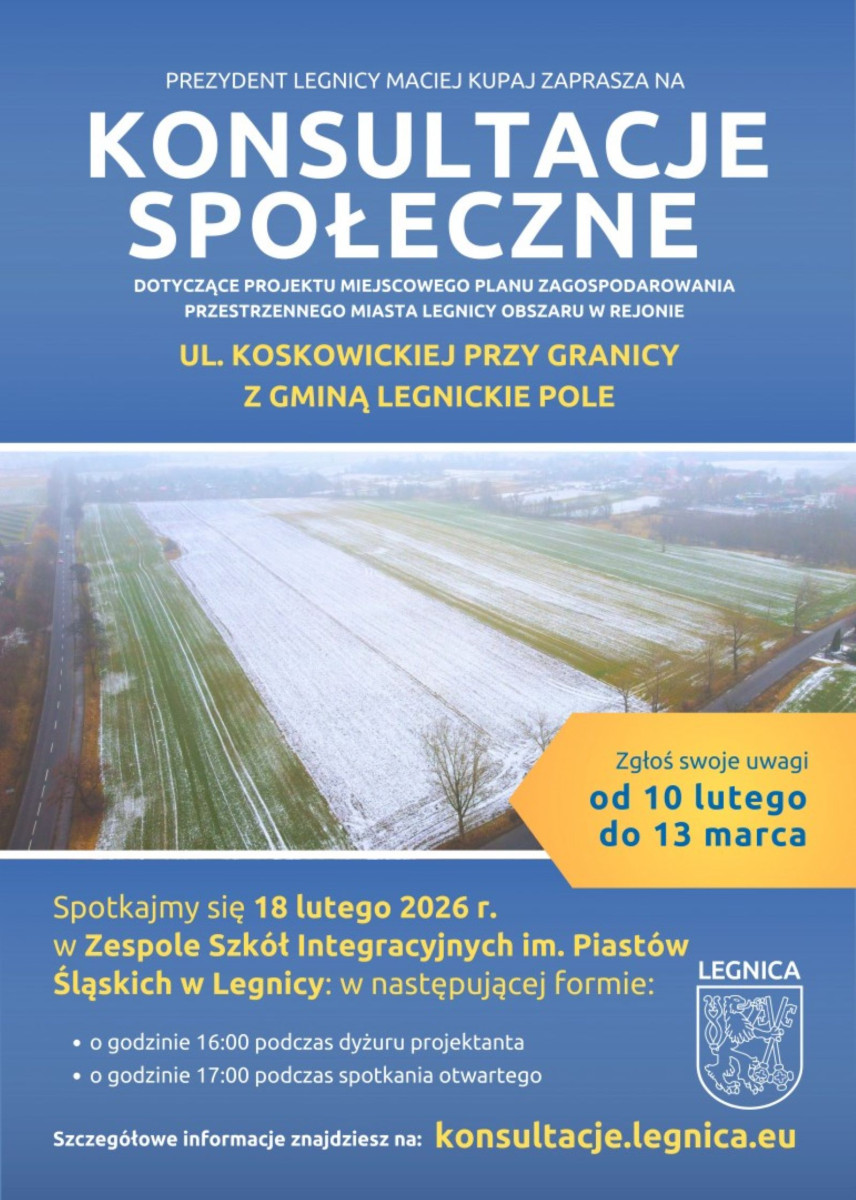 Rozpoczynają się konsultacje społeczne dotyczące projektu miejscowego planu zagospodarowania przestrzennego dla obszaru położonego w rejonie ul. Koskowickiej, przy granicy z Gminą Legnickie Pole. Mieszkańcy będą mogli zgłaszać uwagi i opinie do proponowanych rozwiązań planistycznych dla tego terenu.
