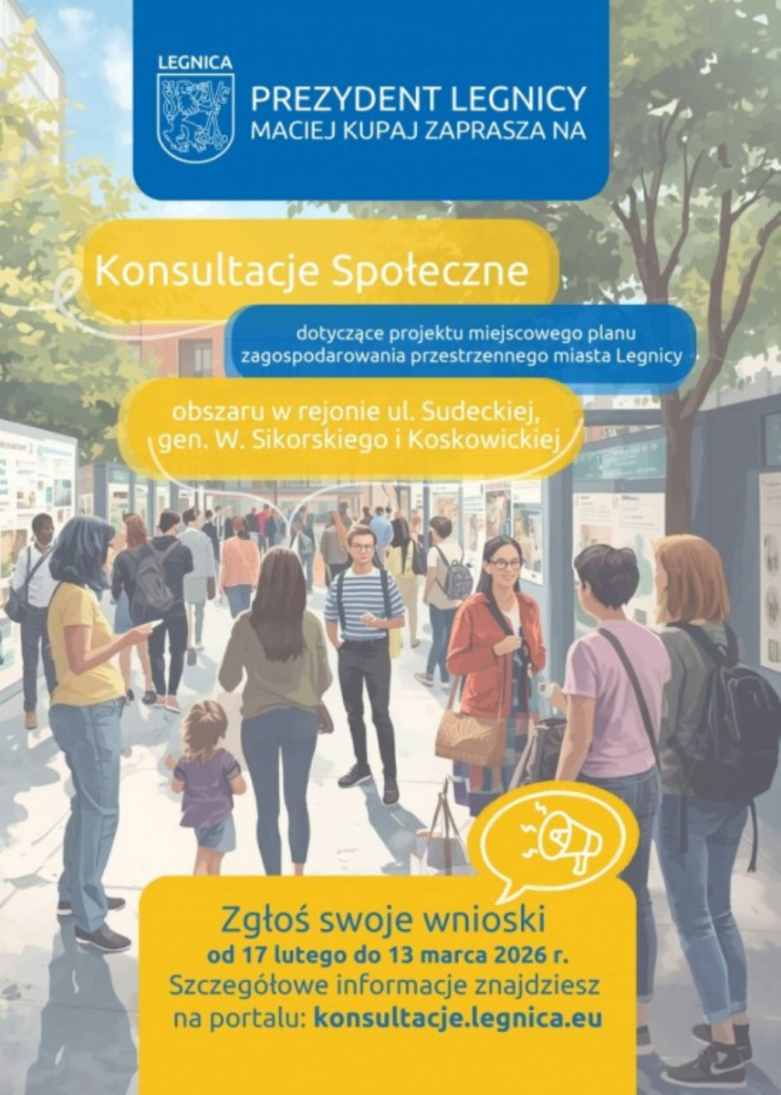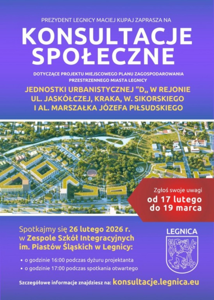 Prezydent Legnicy Maciej Kupaj ogłosił dwa procesy konsultacyjne dotyczące projektów miejscowych planów zagospodarowania przestrzennego. Mieszkańcy mogą składać uwagi do planu dla jednostki urbanistycznej „D” w rejonie ul. Jaskółczej, Kraka, W. Sikorskiego i al. Marszałka Józefa Piłsudskiego oraz do projektu obejmującego obszar w rejonie ul. Sudeckiej, gen. W. Sikorskiego i Koskowickiej.