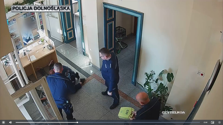 Policjanci uratowali życie starszego mężczyzny, który nagle stracił przytomność w budynku Sądu Okręgowego w Legnicy. Senior upadł tuż przy wejściu do gmachu, a jego oddech stawał się coraz słabszy. Funkcjonariusze natychmiast rozpoczęli reanimację i użyli defibrylatora AED. Dzięki ich działaniu mężczyzna przeżył i po przewiezieniu do szpitala odzyskał przytomność.