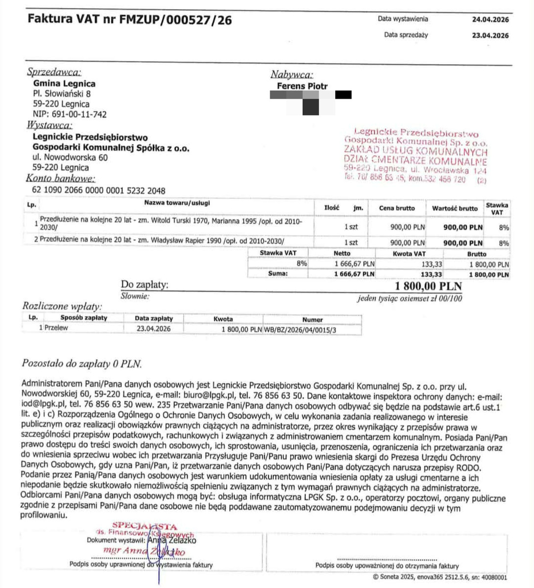 W akcję zaangażowało się 22 darczyńców, którzy wspólnymi siłami dołożyli cegiełkę do ochrony narodowej historii. Piotr Ferens nie kryje wzruszenia, nazywając postawę wspierających niesamowitą i dziękując za każde przekazane wsparcie. Pieniądze zostały wpłacone w piątek 24 kwietnia, na konto zarządcy nekropolii jeszcze w najbliższy piątek, co ostatecznie zamknie formalności związane z prolongatą.