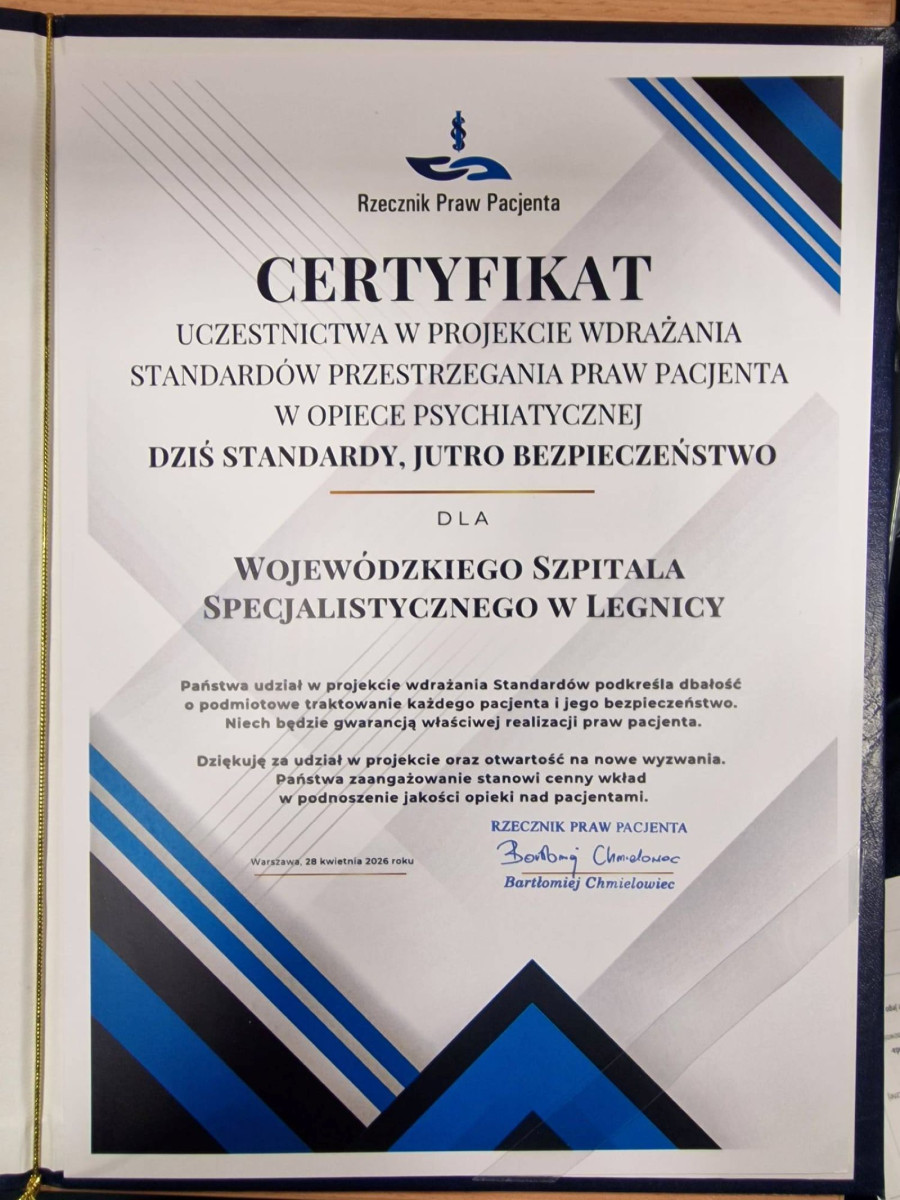 Wojewódzki Szpital Specjalistyczny w Legnicy znalazł się w gronie placówek wyróżnionych za działania na rzecz praw pacjenta w opiece psychiatrycznej. Podczas konferencji, która odbyła się 28 kwietnia w Instytucie Psychiatrii i Neurologii w Warszawie, placówka otrzymała certyfikat potwierdzający udział w ogólnopolskim projekcie oraz zaangażowanie w poprawę jakości i bezpieczeństwa opieki.