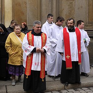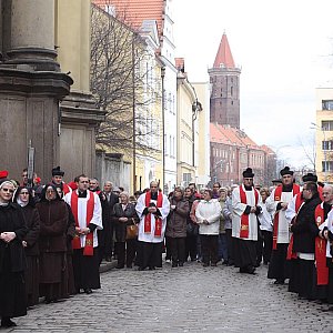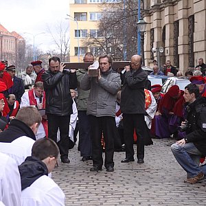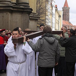 Wielkopiątkowa liturgia (Nabożeństwo Wielkiego Piątku) jest pamiątką męki i śmierci Jezusa Chrystusa zabitego na krzyżu. Przed śmiercią był On biczowany, poddany mękom, zmuszony do dźwigania krzyża, ukrzyżowany i wyszydzany na nim. Kapłani celebrują Liturgię w czerwonych ornatach. Liturgia zaczyna się bez pieśni, główny kapłan celebrujący leży kila minut krzyżem przed ołtarzem (Prostracja). Dalej następuje Liturgia Słowa Bożego - w jej skład wchodzą dwa czytania, psalm (bez organów) oraz opis Męki Pańskiej z Ewangelii św. Jana. Po kazaniu następuje Adoracja Krzyża, podczas której kapłani, służba liturgiczna i wierni całują rany Jezusa na krzyżu. Po adoracji Najświętszy Sakrament zostaje przyniesiony z Ciemnicy i następuje Komunia św. Po jej zakończeniu Jezus pod postacią eucharystyczną zostaje przeniesiony do Grobu, gdzie zaczyna się adoracja.[FOTORELACJA]2120[/FOTORELACJA]