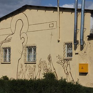 Na ścianie w jej centralnym punkcie umieszczono postać papieża – Polaka. Po lewej stronie jest Maryja z Jezusem, a z prawej części namalowano sylwetkę zamordowanego kapelana „Solidarności”.