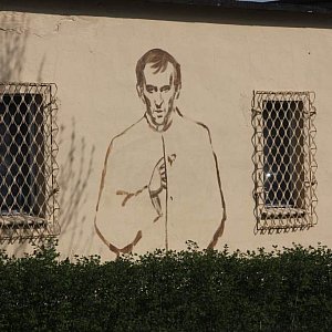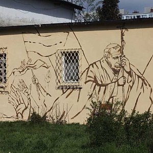 Chrystusa, Matkę Boską, papieża Jana Pawła II, ks. Jerzego Popiełuszkę oraz szachownicę lotniczą - znak polskich sił powietrznych namalowano na tyłach plebani w parafii Matki Bożej Królowej Polski w Legnicy.