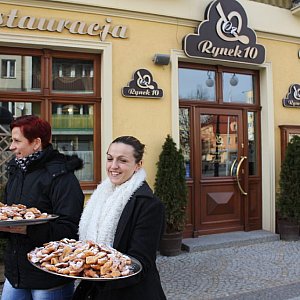Rynek 10 rozpoczął świętowanie Tłustego Czwartku konkursem, ale przygotował też słodką ofertę dla swoich klientów, a także legniczan spacerujących w Rynku. Zaraz po pączkowej rywalizacji, kelnerki częstowały chętnych faworkami. Ponadto do każdego obiadowego zamówienia na wynos, restauratorzy dorzucali darmowe pączki.