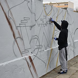 Na graffiti królują geometryczne wzory w barwach głównie czerni, złota i czerwieni. Praca grafficiarzy i dzieci już wzbudza emocje i zachwyt legniczan. Spacerowicze zatrzymują się i podziwiają kilkudziesięciometrowe dzieło.