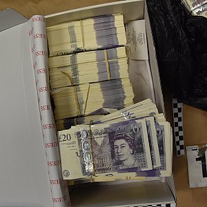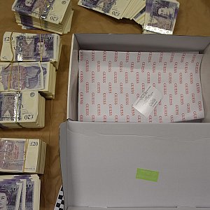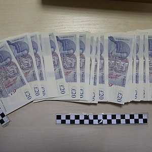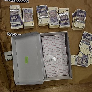 Policjanci dokonali przeszukania zajmowanych przez pomieszczeń mieszkalnych i gospodarczych. Na strychu budynku jednorodzinnego znaleźli ukryte za szafą dwa pudełka z zawartością 86,6 tys funtów brytyjskich. Pieniądze zostały poddane ekspertyzie w Narodowym Banku Polskim. Okazało się,że banknoty to mistrzowsko podrobione, trudne do rozpoznania przez nieprofesjonalistów falsyfikaty.