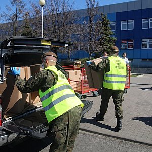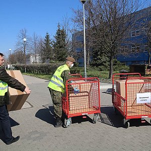 Młodzi noszą kartony prosto na szpitalne wozidełka. Za chwilę w tych kombinezonach zobaczymy pielęgniarki i lekarzy. Warto zadbać również o stroje ochronne dla pozostałego personelu szpitalnego.