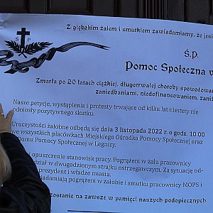Około stu pracowników Miejskiego Ośrodka Pomocy Społecznej i Domu Pomocy Społecznej wzięło udział w pikiecie przed legnickim Ratuszem. Ogromna większość z nich udała się na sesję, gdzie zabrali ze sobą między innymi wieniec i znicz pogrzebowy symbolizujące zgon legnickiej pomocy społecznej. Domagają się podwyżek i zapowiadają strajk ostrzegawczy.