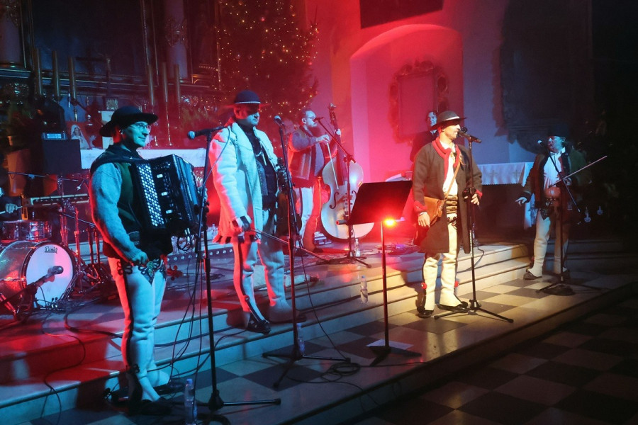 W szczelnie wypełnionym kościele zabrzmiały zarówno radosne, rytmiczne utwory, jak i bardziej nastrojowe pieśni. W świątyni wystąpiła kapela „Staszek z Gór”, grupa muzyków silnie związanych z Podhalem i jego folklorem. Artyści sięgnęli po tradycyjne instrumenty i wykonali znane wszystkim kolędy i pastorałki, nadając im dynamiczne i wyraziste brzmienie, w którym brzmiało echo góralskiej muzyki.