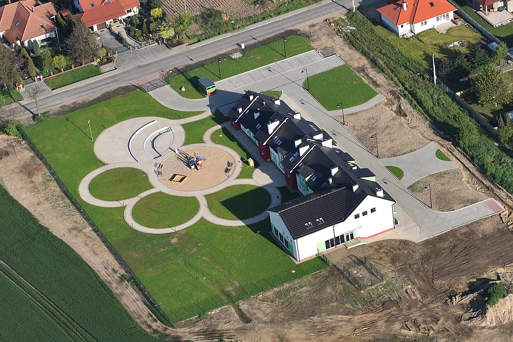 Nie mniej okazale prezentuje się teren wokół przedszkola. Znalazł się tam plac zabaw, na którym wydzielono obszary dostosowane trudnością dla różnych grup wiekowych, amfiteatr i mini boisko do gry w piłkę.
