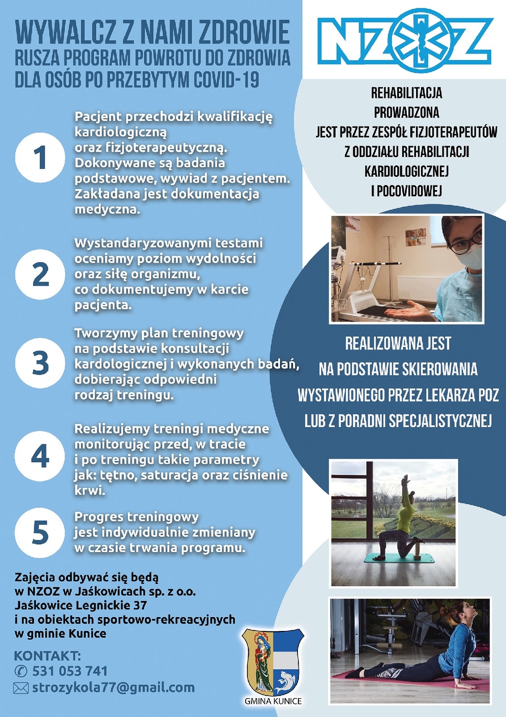 Uruchomienie rehabilitacji było możliwe dzięki współpracy Niepublicznego Zakładu Opieki Zdrowotnej w Jaśkowicach Legnickich oraz oddziału rehabilitacji kardiologicznej, oraz postcovidowej Szpitala Wojewódzkiego w Legnicy. Oznacza to, że mieszkańcy gminy Kunice mogą na miejscu skorzystać z bezpłatnej rehabilitacji prowadzonej przez wykwalifikowany zespół fizjoterapeutów.
