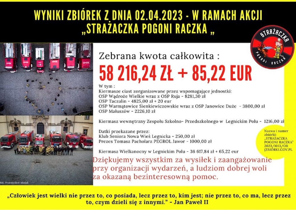 Akcja zatoczyła szerokie kręgi i włączyli się do niej druhowie z OSP Wądroże Wielkie, Ruja, Taczalin, Warmątowice Sienkiewiczowskie, Janowice Duże i Małuszów. Wsparli ich także uczniowie i przedszkolaki z Zespołu Szkolno-Przedszkolnego w Legnickim Polu, seniorzy z Klubu Seniora Nowa Wieś Legnicka oraz prezes firmy „Pergol” w Jaworze.