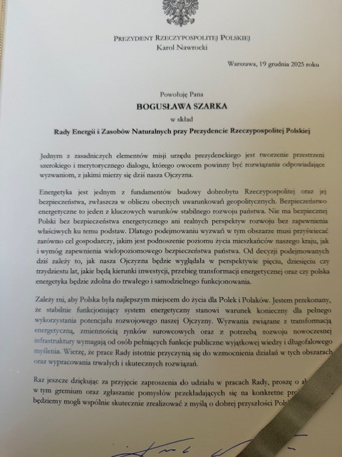Energetyka jest jednym z fundamentów budowy dobrobytu Rzeczypospolitej oraz jej bezpieczeństwa, zwłaszcza w obliczu obecnych uwarunkowań geopolitycznych. Bezpieczeństwo energetyczne to jeden z kluczowych warunków stabilnego rozwoju państwa. Nie ma bezpiecznej Polski bez bezpieczeństwa energetycznego ani realnych perspektyw rozwoju bez zapewnienia właściwych ku temu podstaw. Dlatego podejmowaniu wyzwań w tym obszarze musi przyświecać zarówno cel gospodarczy, jakim jest podnoszenie poziomu życia mieszkańców naszego kraju, jak i wymóg zapewnienia wielopoziomowego bezpieczeństwa państwa. Od decyzji podejmowanych dziś zależy to, jak nasza Ojczyzna będzie wyglądała w perspektywie pięciu, dziesięciu czy trzydziestu lat, jakie będą kierunki inwestycji, przebieg transformacji energetycznej oraz czy polska energetyka będzie zdolna do trwałego i samodzielnego funkcjonowania – napisał liście powołujących do Rady Prezydent RP Karol Nawrocki.