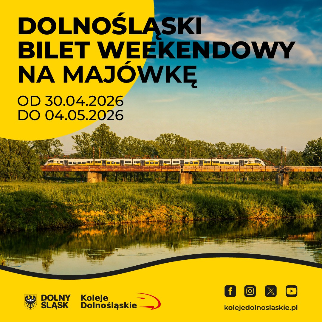 Koleje Dolnośląskie przedłużają na majówkę obowiązywanie Dolnośląskiego Biletu Weekendowego. Od 30 kwietnia od godziny 18:00 do 4 maja do godziny 6:00 można podróżować bez ograniczeń pociągami Kolei Dolnośląskich i POLREGIO za 59 zł. W praktyce oznacza to kilka dni swobodnego przemieszczania się jednym biletem, bez konieczności kupowania kolejnych przejazdów i sprawdzania każdej ceny osobno.