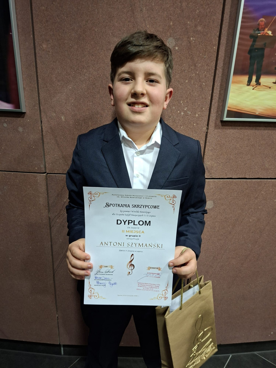 Antoni Szymański, uczeń klasy czwartej Ogólnokształcącej Szkoły Muzycznej I stopnia w Zespole Szkół Muzycznych imienia Fryderyka Chopina w Legnicy, zdobył drugie miejsce w II grupie podczas Spotkań Skrzypcowych ku pamięci Witolda Rowickiego, które odbyły się w Żywcu. To jeden z ważniejszych konkursów skrzypcowych dla młodych muzyków i w tym roku ponownie zgromadził uczestników z Polski i zza granicy. Jury podkreślało bardzo wysoki poziom wykonawczy, dlatego zdobycie wyróżnienia w takim gronie jest dużym osiągnięciem.