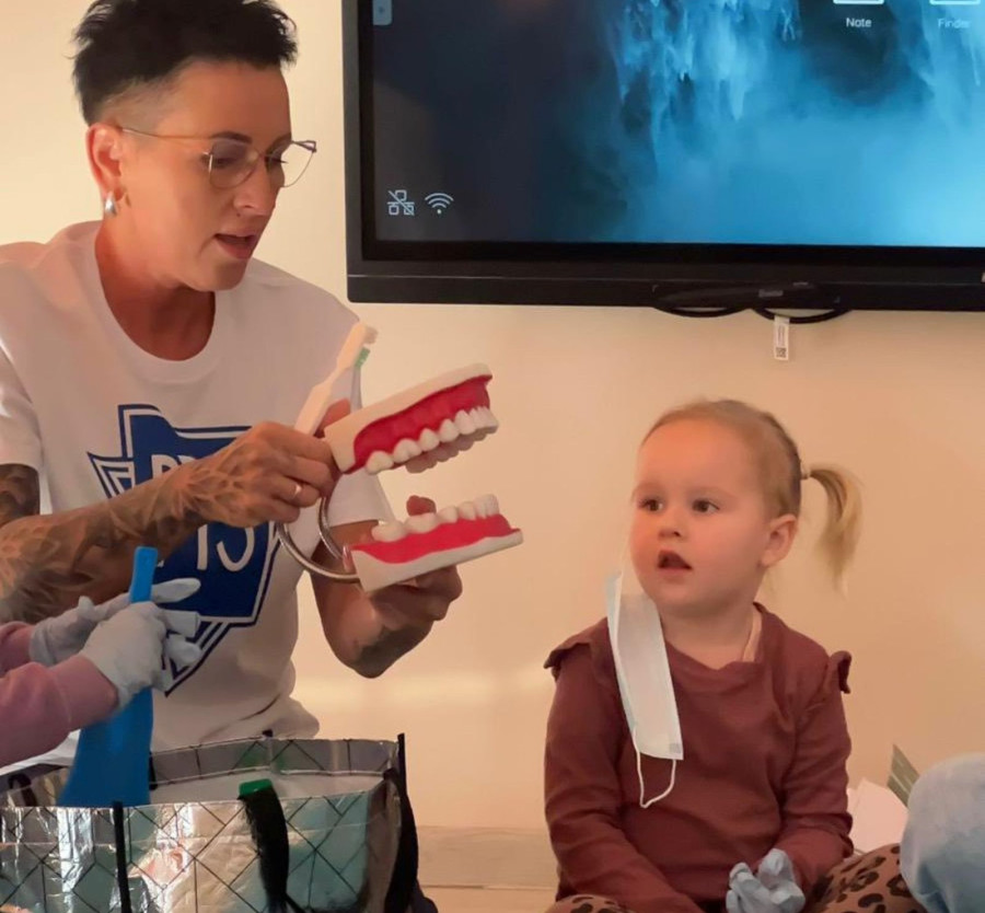 Podczas wizyty higienistka stomatologiczna pokazała najmłodszym, jak prawidłowo dbać o zęby. Największym zainteresowaniem cieszył się trening szczotkowania przeprowadzony na dużym modelu szczęki, dzięki któremu dzieci mogły zobaczyć, jak dokładnie czyścić zęby i dlaczego regularne szczotkowanie jest tak ważne.