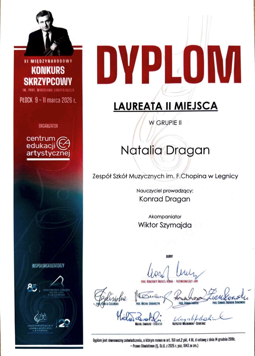 Natalia Dragan, uczennica klasy V Ogólnokształcącej Szkoły Muzycznej II stopnia w Zespole Szkół Muzycznych im. Fryderyka Chopina, zdobyła II nagrodę podczas XI Międzynarodowych Spotkań Młodych Skrzypków im. prof. Mirosława Ławrynowicza w Płocku. Konkurs zgromadził młodych skrzypków z różnych ośrodków muzycznych.