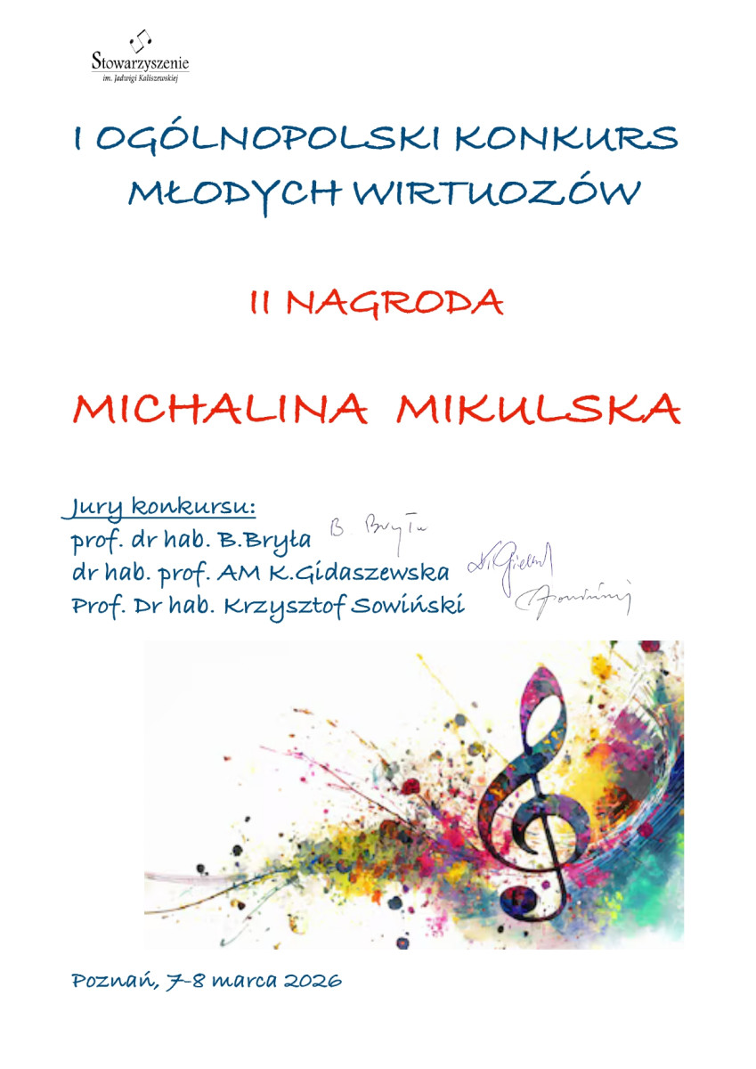 Michalina Mikulska, mimo że kształci się dopiero w pierwszej klasie cyklu sześcioletniego, zdołała oczarować jury swoją interpretacją i techniką. Zdobycie II nagrody w tak silnej konkurencji to dowód na jej ogromny talent oraz muzyczną dojrzałość.
