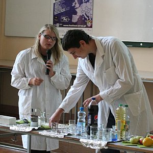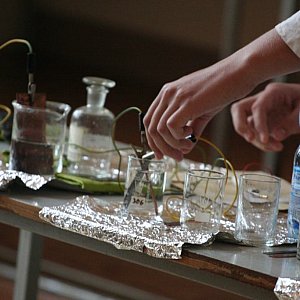 O tym czy baterie mogą być bezpieczne opowiedziała słucaczom dr inż. Katarzyna Sobianowska (chemik, Wydział Chemiczny, PWr). Uczestnicy zajęć biorąc aktywny udział w ciekawych zajęciach sami konstruowali domowym sposobem baterie i sprawdzali czy woda, ocet i olej przewodzą prąd elektryczny.