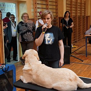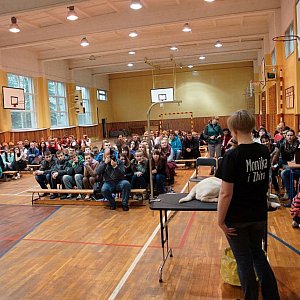 Widowiskowy pokaz tresury psów przeprowadził ośrodek szkolenia „Woof” z Wrocławia, wraz z Karoliną Janecką, uczennicą ZSR, która razem z mamą również zajmuje się tresurą psów. Mogliśmy zobaczyć jedyną wrocławską drużynę trenującą flyball, oraz frisbee w wykonaniu Karoliny, jej suczki Triss i labladorki Tissaia.