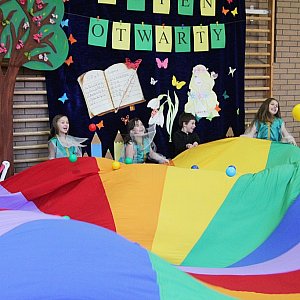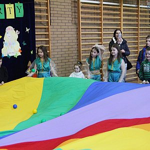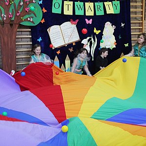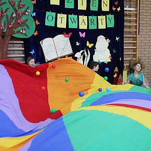 Zwiedzanie szkoły maluchy i ich rodzice rozpoczęli od wspólnej zabawy na sali gimnastycznej, gdzie powitał gości sam dyrektor. Wiele emocji wzbudziły zabawy z chustą, wspólna zumba i „Taniec Perski Wof Dżafar” w wykonaniu najmłodszych uczniów.