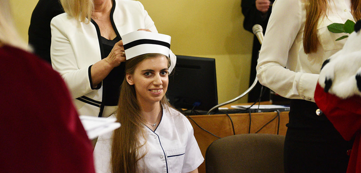 Pierwszą, bardzo ważną częścią wydarzenia była uroczystość czepkowania, podczas której dwadzieścia siedem studentek odebrało białe czepki z czarnym paskiem, a dwóch studentów metalową miniaturkę czepka. Zanim to się stało zapłonęła lampka dla Florence Nightingale, angielskiej pielęgniarce uważanej za twórczynię nowoczesnego pielęgniarstwa. Dzięki tej symbolice stworzono wspólną przestrzeni łączącą młodsze i starsze pokolenia pielęgniarek.