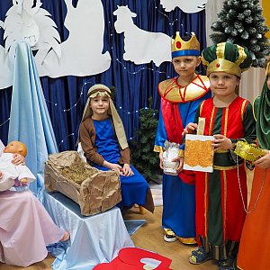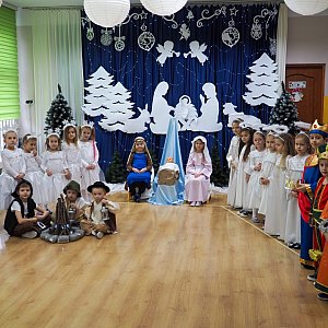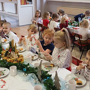 W Przedszkolu Źródełku zorganizowano Wigilię. Od samego rana unosił się zapach pieczonych pierniczków i gotowanego barszczyku, a w salach przedszkolnych słychać było kolędy.