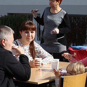 Nie brakowało innych atrakcji. Było malowanie twarzy i stylizowanie fryzur. Była też degustacja potraw ze szkolnej stołówki, którymi wszyscy się zajadali. Do wyboru mieli żurek, barszcz z krokietem i bigos. O chleb ze smalcem postarała się wielka przyjaciółka szkoły, o ciasta – rodzice. O dobry nastrój starali się wszyscy, zarówno uczniowie, rodzice i nauczyciele.