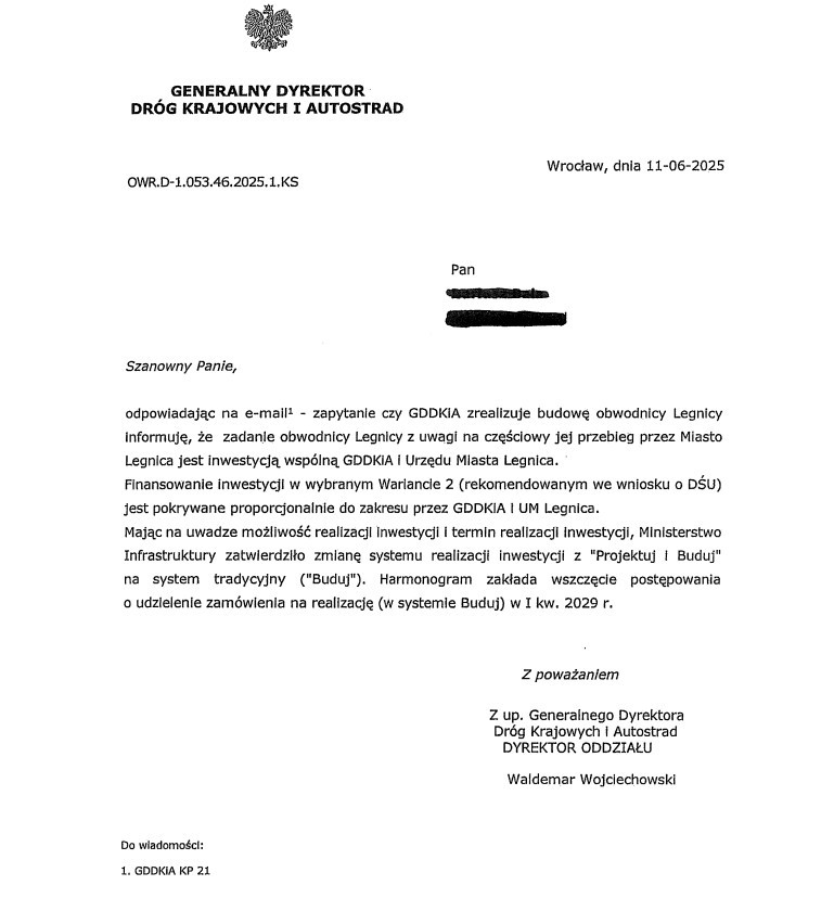 Warto na koniec przypomnieć, że obwodnica Legnicy, mimo iż również jest zaplanowana w rządowym Programie Budowy 100 Obwodnic, nadal nie wyszła poza etap przygotowań. Wniosek o wydanie decyzji o środowiskowych uwarunkowaniach został złożony jeszcze 14 kwietnia 2023 roku, ale procedura wielokrotnie się przeciągała. Początkowo dokumenty trafiły do Urzędu Miasta Legnicy, który uznał, że nie jest właściwym organem do ich wydania, co doprowadziło do sporu kompetencyjnego i ostatecznie sprawa trafiła do Regionalnej Dyrekcji Ochrony Środowiska we Wrocławiu. GDDKiA uzupełniła dokumentację w październiku 2024 roku, a potem, mimo zapowiedzi, że decyzja powinna pojawić się do połowy 2025 roku, decyzji wciąż nie ma. Bez niej projekt obwodnicy, który miał ominąć miasto od północy i być gotowy w 2029 roku, stoi w miejscu, a jego dalsze losy są na dziś niepewne.