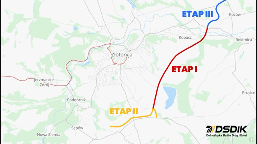 Pierwszy etap obejmuje budowę około 4 kilometrów nowej trasy, która ma przejąć ruch tranzytowy i odciążyć centrum Złotoryi. W planach znajdują się między innymi dwa ronda, nowe skrzyżowania oraz most nad Kaczawą. To właśnie ten fragment ma w pierwszej kolejności poprawić płynność ruchu i bezpieczeństwo mieszkańców.