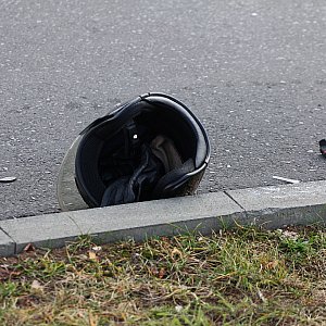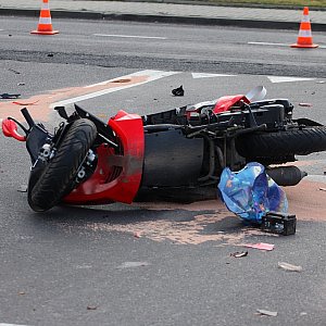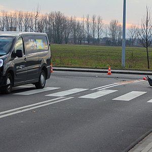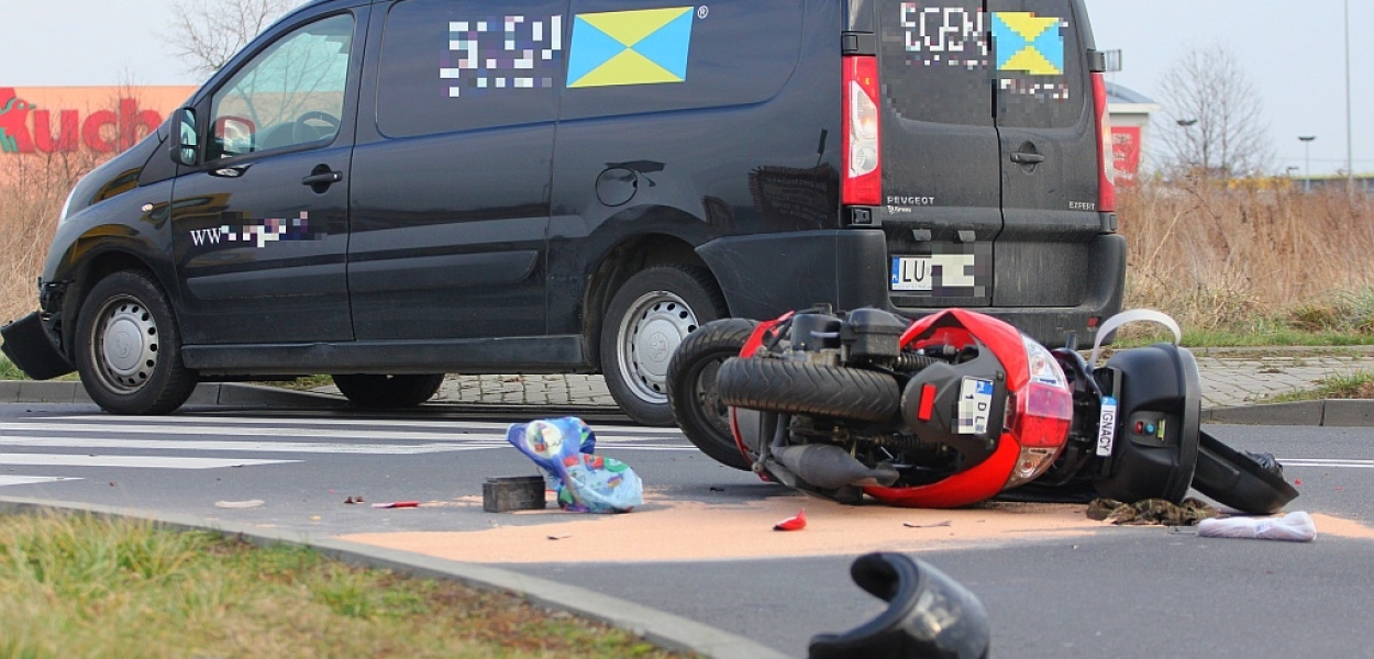 Poważnych obrażeń nogi po zderzeniu z samochodem osobowym do którego doszło w piątkowe popołudnie w okolicach lotniska doznał mężczyzna jadący skuterem.
