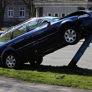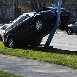 Dość nietypowo zakończył swoją podróż kierowca volkswagena. „Zaparkował” na latarni przy ul. Piastowskiej. Na szczęście w zdarzeniu ucierpiał jedynie samochód.