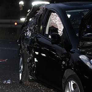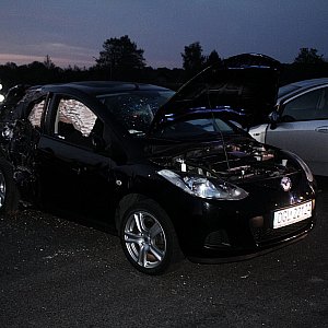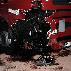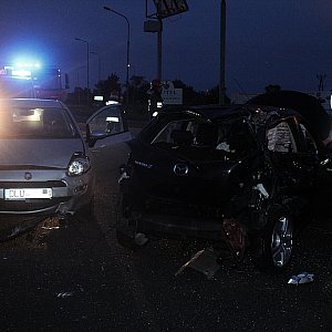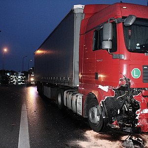TIR uderzył w tył mazdy, która odbiła się i uderzyła w wyjeżdżający z drogi podporządkowanej samochód osobowy marki Fiat. Jedna osoba została ranna.