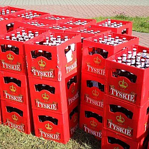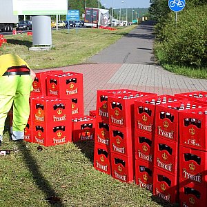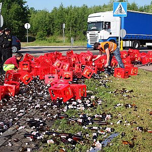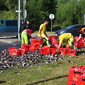 Tysiące butelek z piwem wyleciało z tira na rondzie Unii Europejskiej w pobliżu Huty Miedzi Legnica.