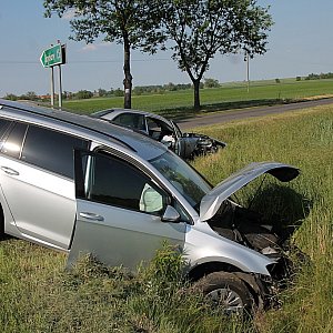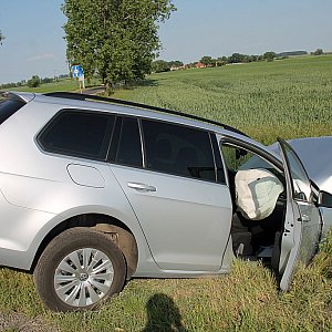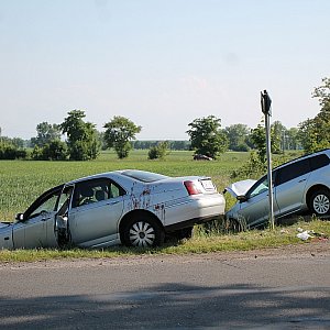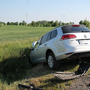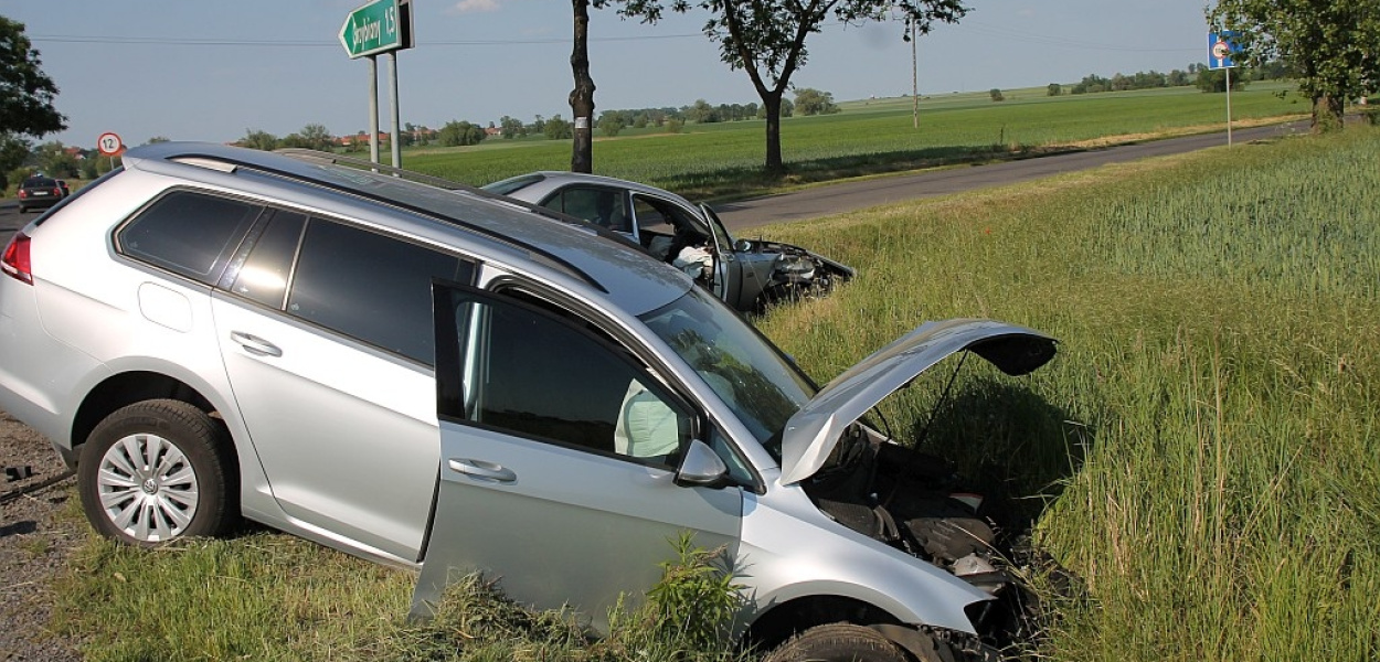Kierowca Land Rowera nie zachował należytej ostrożności przy wyjeździe z drogi z Grzybian i uderzył w jadącego prawidłowo drogą z Koskowic Volkswagena. Dwie osoby zostały ranne.