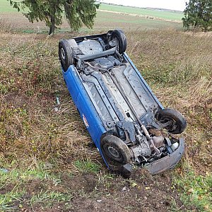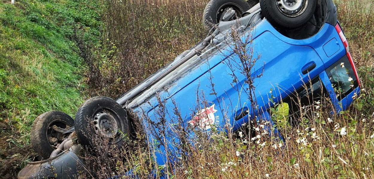 Mężczyzna jadący samochodem marki Fiat Panda, nie dostosował prędkości do warunków panujących na drodze. Stracił panowanie nad kierownicą i na łuku drogi wypadł z niej dachując do rowu.