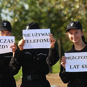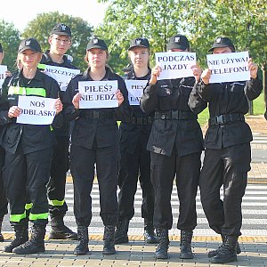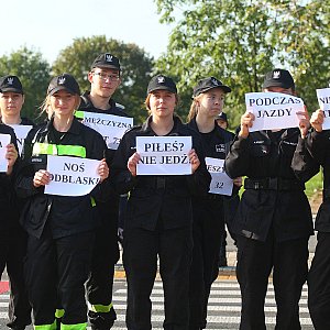 Dzisiaj policjanci Wydziału Ruchu Drogowego Komendy Miejskiej Policji w Legnicy wspólnie z uczniami klas policyjnych VII Liceum Ogólnokształcącego w Legnicy przy użyciu tablic z różnymi hasłami dotyczącymi zasad bezpieczeństwa lub symbolizujące ofiary wypadków drogowych wchodzili na przejścia dla pieszych, znajdujące się na ulicy Piłsudskiego w Legnicy, aby zwrócić uwagę kierowców i pieszych na bezpieczne poruszanie się po drodze.