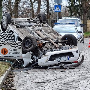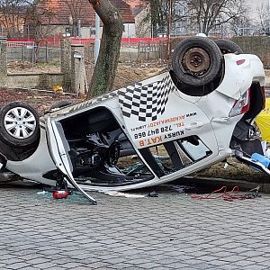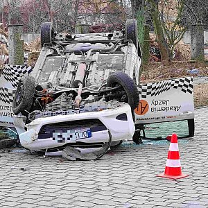Do szpitala trafił 45-latek, który stracił panowanie nad samochodem i dachował. Mężczyzna jechał samochodem nauki jazdy. Przyczyny i okoliczności wypadku wyjaśnia policja.