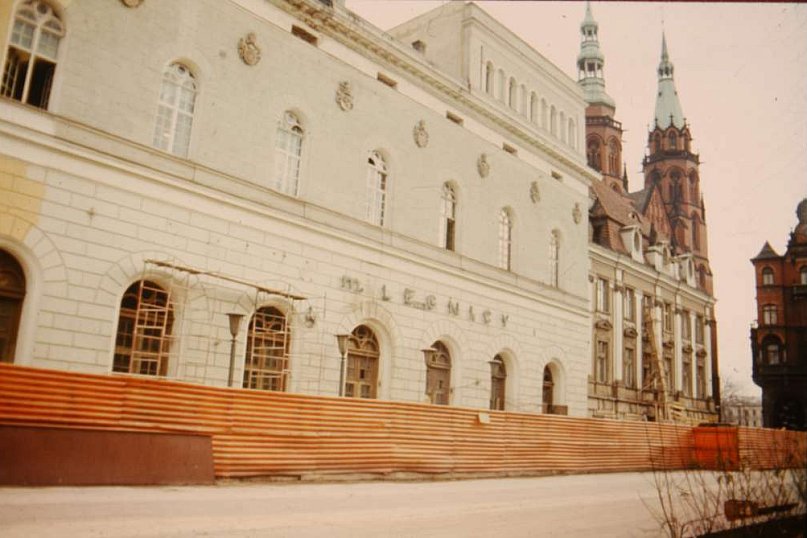 Archiwalne zdjęcia z budowy legnickiego teatru, przedstawień, pochodów pierwszomajowych, czynów społecznych i bankietów popremierowych.