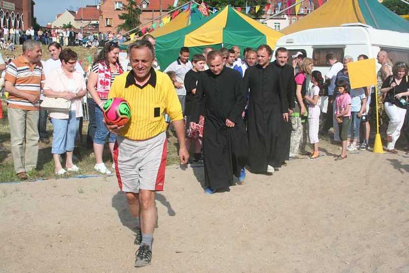 Mecz piłki nożnej plażowej księża kontra strażacy. 15-17 wygrali strażacy.