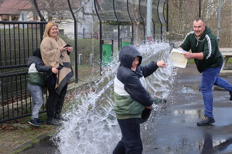 Wójt Krzysztof Błądziński i strażacy z OSP nie brali jeńców – wielkie wiadra poszły w ruch, a sucha nitka nie została na nikim! Mimo chłodu, atmosfera była gorąca. Zobacz, jak Kunice kultywują tradycję Śmigusa-Dyngusa!
