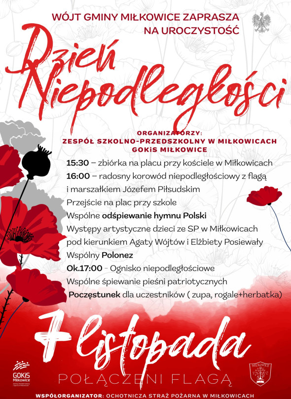 16:00 – radosny korowód niepodległościowy z flagą i marszałkiem Józefem PiłsudskimPrzejście na plac przy szkoleWspólne odśpiewanie hymnu PolskiWystępy artystyczne dzieci ze SP w Miłkowicach pod kierunkiem Agaty Wójtów i Elżbiety PosiewałyWspólny Polonez