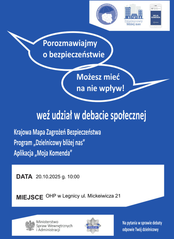 Wydział Prewencji Komendy Miejskiej Policji w Legnicy serdecznie zaprasza mieszkańców na debatę społeczną poświęconą problematyce hejtu i przemocy rówieśniczej, która odbędzie się 20 listopada 2025 roku o godzinie 10:00 w siedzibie Ochotniczych Hufców Pracy w Legnicy przy ul. Mickiewicza 21.