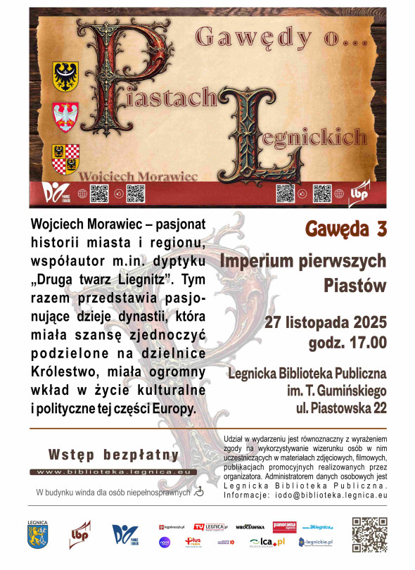 Legnicka Biblioteka Publiczna im. T. Gumińskiego ma przyjemność zaprosić na spotkanie z Wojciechem Morawcem pt. "Wojciecha Morawca gawędy o… Piastach Legnickich: imperium pierwszych Piastów"