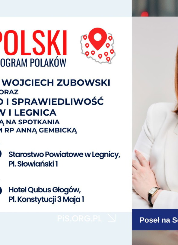 W imieniu Posła na Sejm RP Wojciecha Zubowskiego oraz Komitetów Prawo i Sprawiedliwość Głogów i Legnica zapraszamy na otwarte spotkanie z Poseł na Sejm RP Anną Gembicką, które odbędą się 8 grudnia 2025 r. w Głogowie oraz w Legnicy.