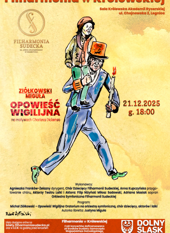 21 grudnia, czeka nas świąteczne spotkanie z cyklem „Filharmonia w Królewskiej”. Orkiestra Symfoniczna Filharmonii Sudeckiej pod batutą Agnieszki Franków-Żelazny wykona oratorium „Opowieść wigilijna” autorstwa Michała Ziółkowskiego (muzyka) i Justyny Miguły (libretto). Na scenie pojawią się także artyści znani z Teatru Lalki i Aktora: Filip Niżyński i Miłosz Sadowski, sopranistka Adriana Masiak, a także Chór Dziecięcy Filharmonii Sudeckiej przygotowany przez Annę Kupczyńską. Początek o godzinie 18:00, bilety w cenie 40 złotych (normalny), 20 złotych (ulgowy) i 1 złoty (dla uczniów Zespołu Szkół Muzycznych) dostępne na stronie bilety.filharmoniasudecka.pl oraz na godzinę przed koncertem.