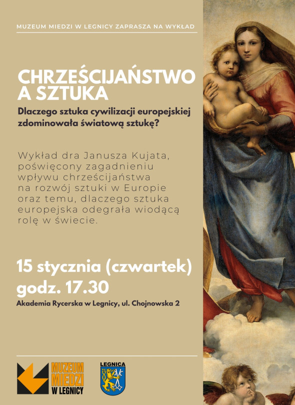 Muzeum Miedzi w Legnicy zaprasza na wykład dr. Janusza Kujata poświęcony wpływowi chrześcijaństwa na rozwój sztuki europejskiej oraz temu, dlaczego sztuka cywilizacji europejskiej odegrała tak znaczącą rolę w skali światowej.